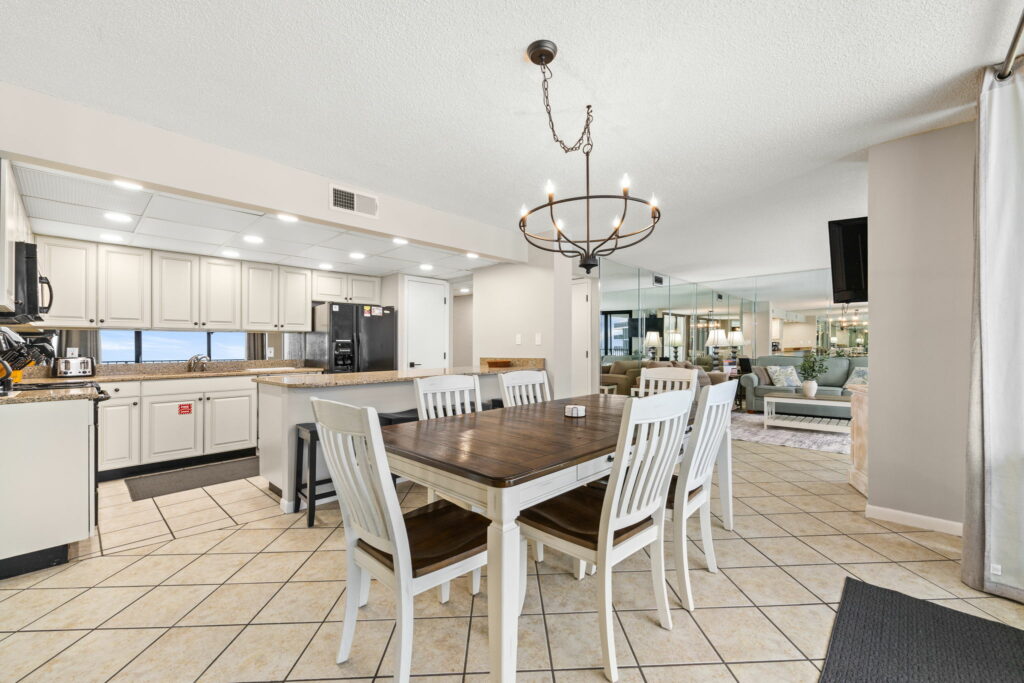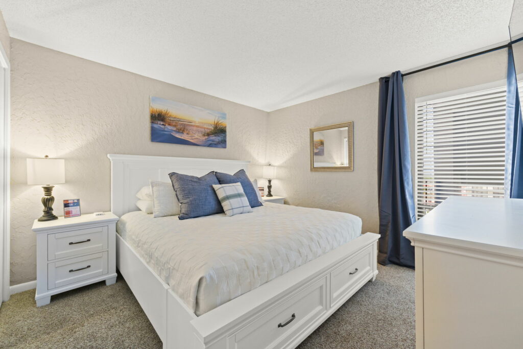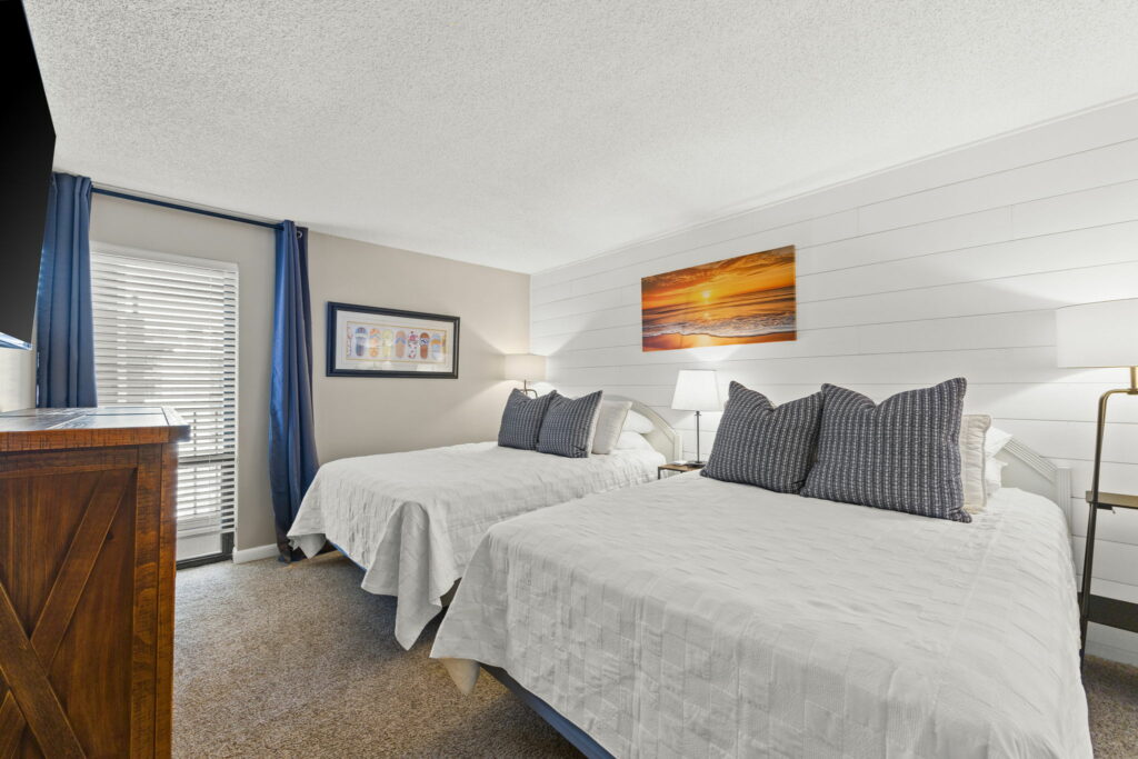 At 1,366 square feet, it comfortably sleeps up to 8 guests with a king bed in the master bedroom, two queen beds in the second bedroom, and a queen pullout sofa in the living room. Both bedrooms have their own 65″ Roku Smart TV, and the living room features a 55″ screen — perfect for movie nights after a long beach day.