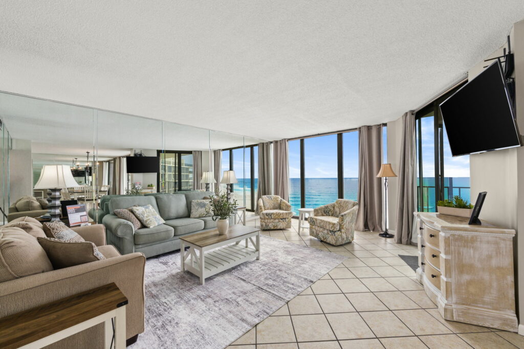 Sunset Getaway is a renovated 2-bedroom, 2-bathroom Gulf-front condo on the 11th floor of Tower 2 at Edgewater Beach & Golf Resort — 11619 Front Beach Road, Unit 1102, Panama City Beach, FL 32407.