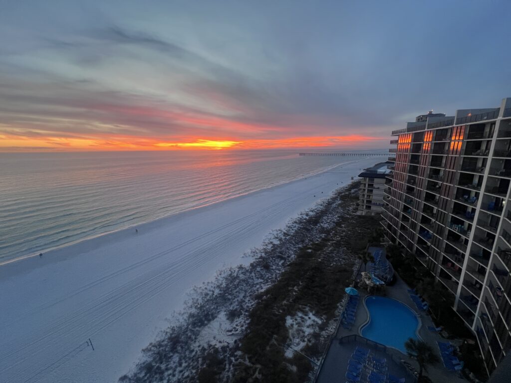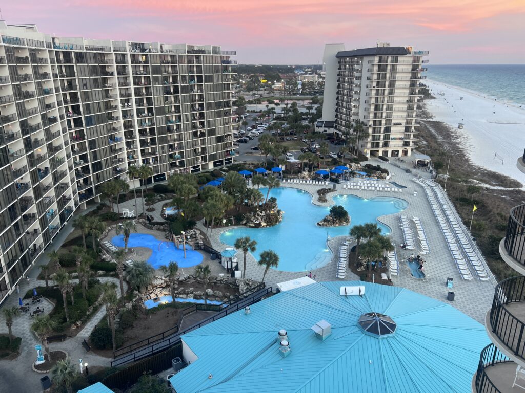 Picture this: You pull up to Edgewater Beach & Golf Resort as the afternoon sun turns the water that unmistakable shade of emerald green. The kids spot the pools from the parking lot, and the excitement starts building before you even check in. You take the elevator to the 11th floor, open the door — and the Gulf of America fills the entire wall in front of you.